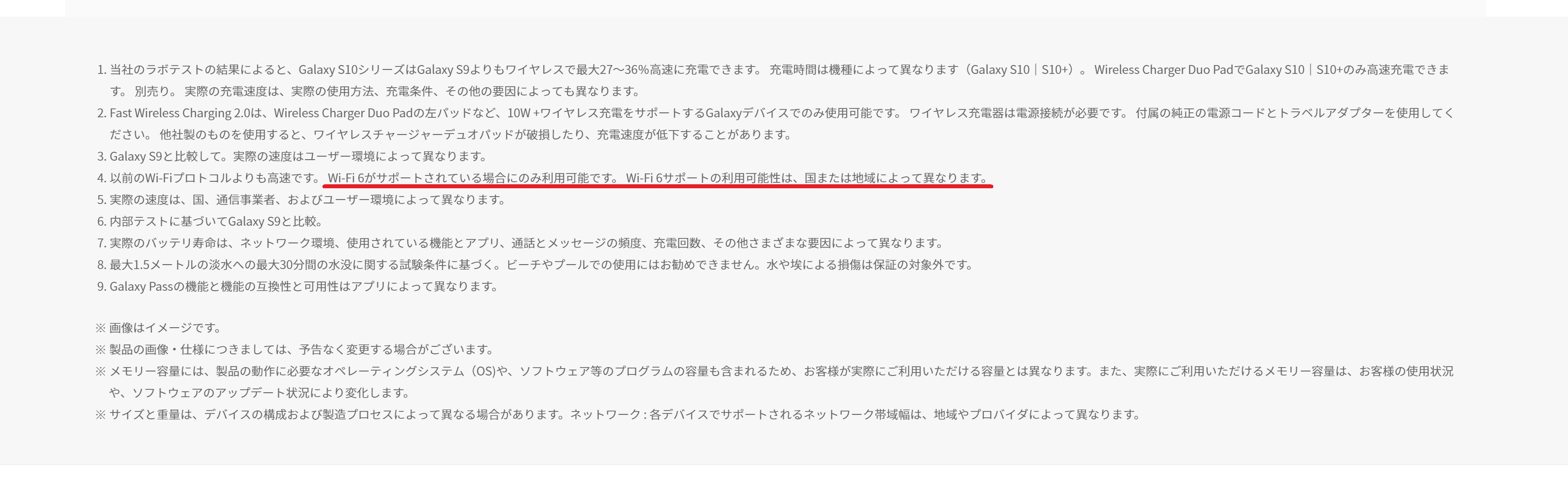 なお、Galaxyの公式サイトを参照すると、Wi-Fi 6に関する説明文は書かれていますが、国や地域によって利用可否は異なると注釈が入っています。各国の対応状況については明記されていません。