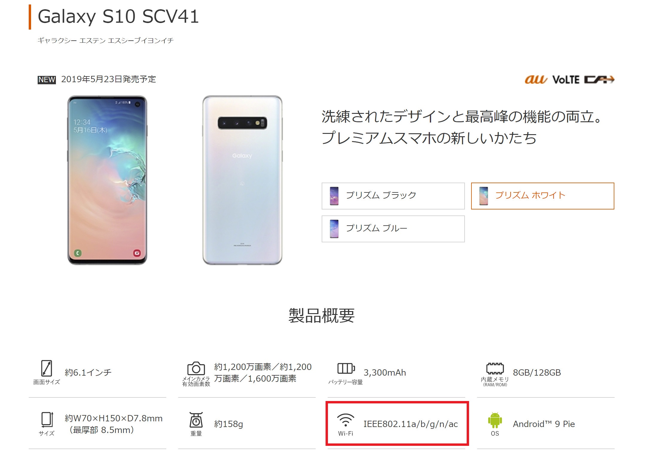 auから「Galaxy S10/S10+」が発表され、auの製品情報ページを参照すると対応Wi-FiがIEEE802.11a/b/g/n/acと表記されており、IEEE802.11ax(Wi-Fi 6)には対応していないように見えます。